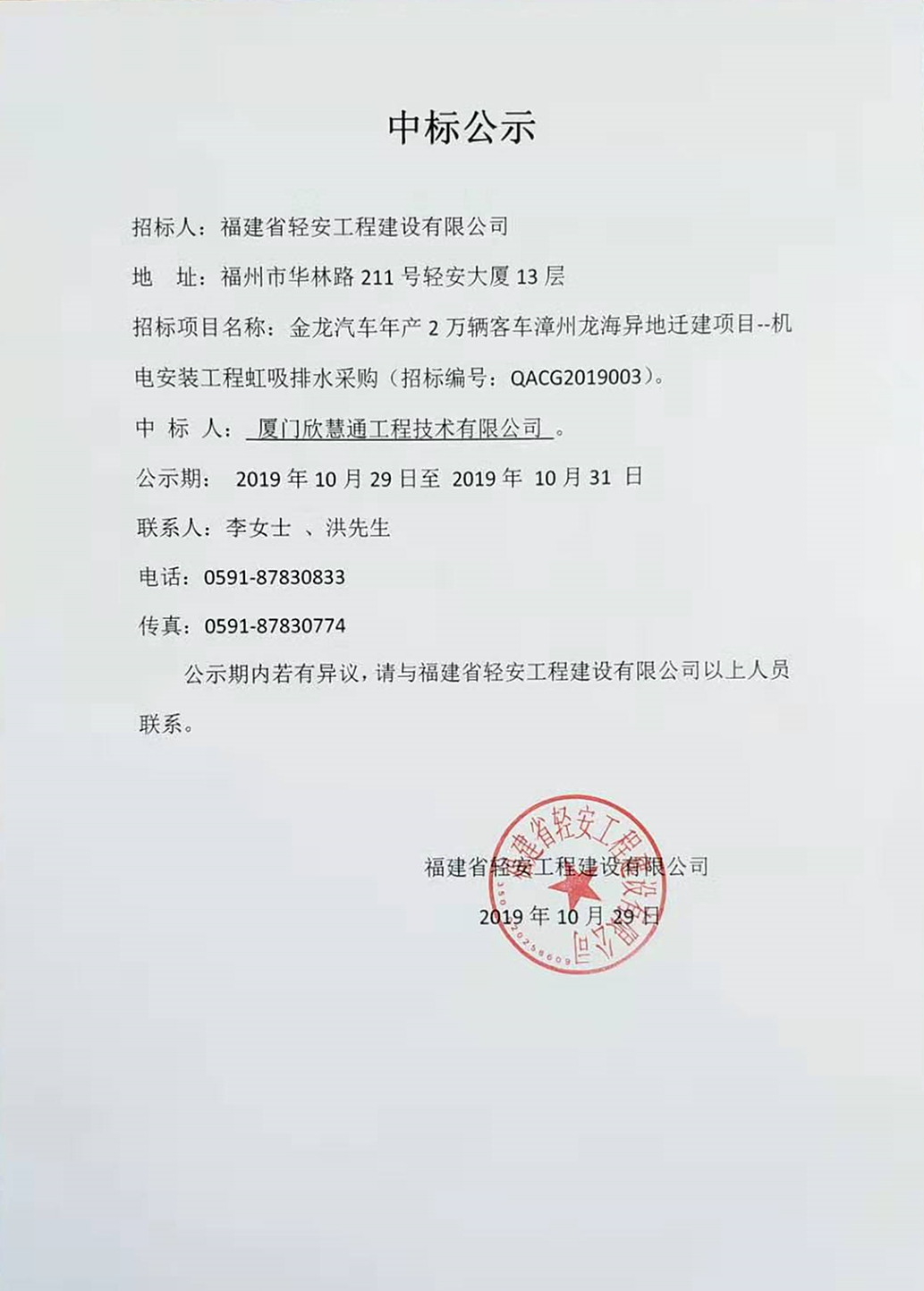 金龍汽車年產2萬輛客車漳州龍海異地遷建項目--機電安裝工程通虹吸排水采購-中標公示