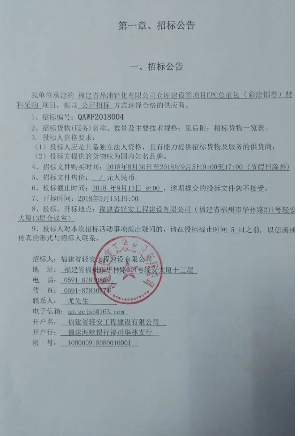 招標公告(福建省晶浦輕化有限公司倉庫建設等項目EPC總承包彩塗鋁卷項目選擇合格供應商