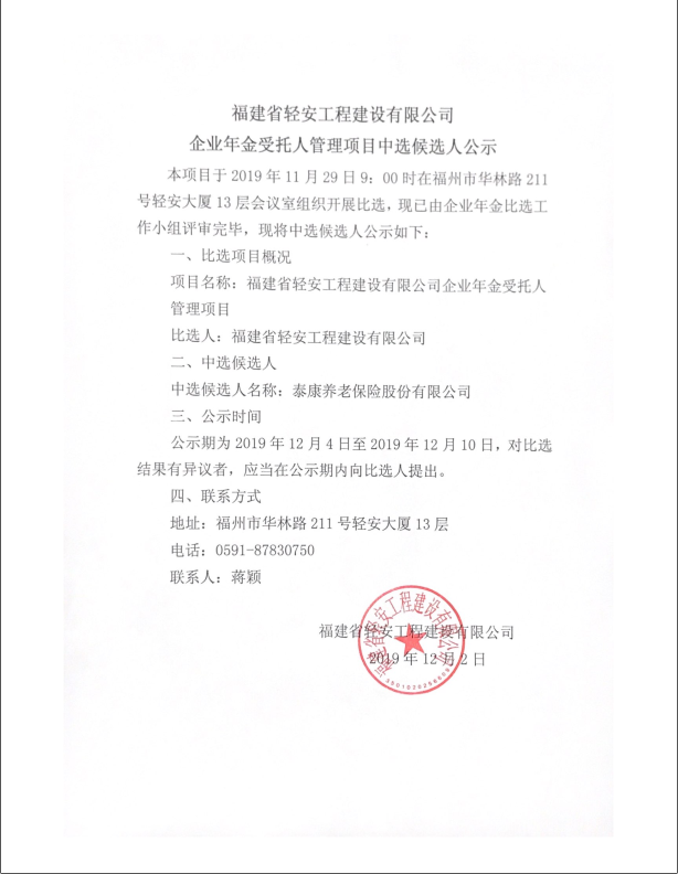 福建省輕安工程建設有限公司企業年金受托人管理項目中選候選人公示