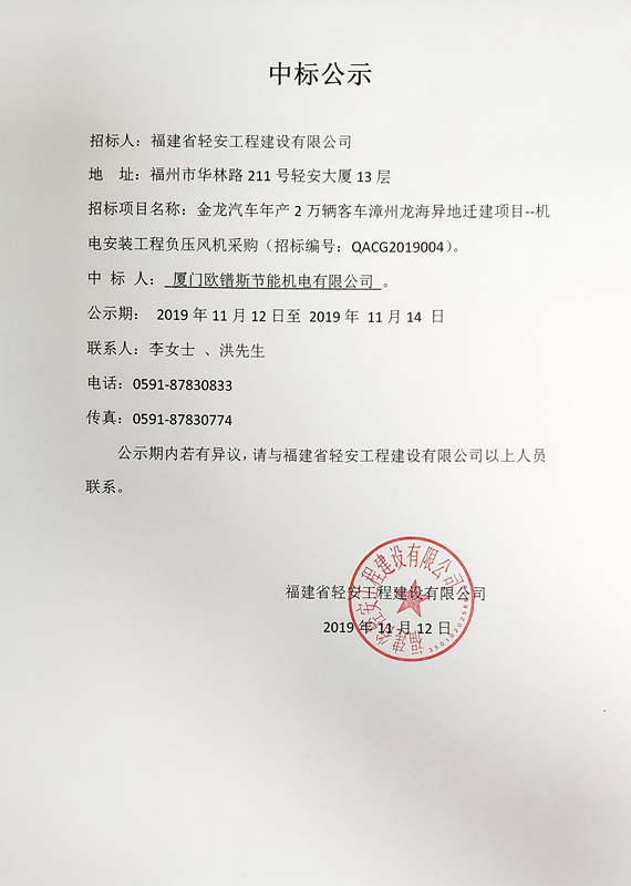 金龍汽車年產2萬輛客車漳州龍海異地遷建項目--機電安裝工程負壓風機采購中標公示(招標編號:QACG2019004)