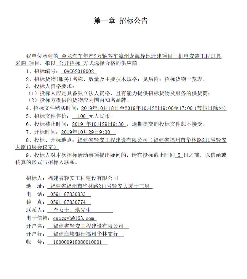 金龍汽車年產2萬輛客車漳州龍海異地遷建項目--機電安裝工程燈具采購招標