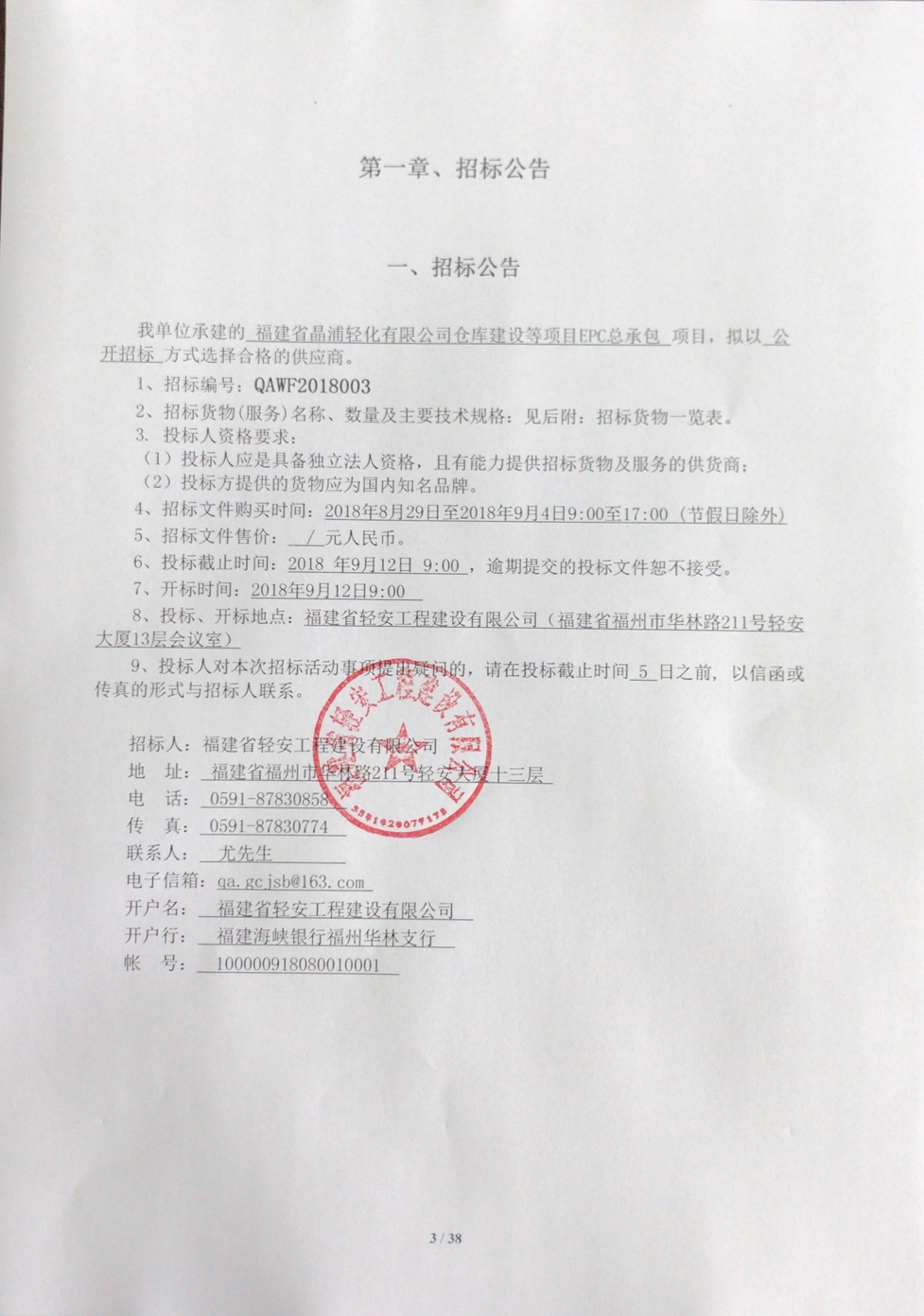 招標公告(福建省晶浦輕化有限公司倉庫建設等項目EPC總承包項目選擇合格供應商)
