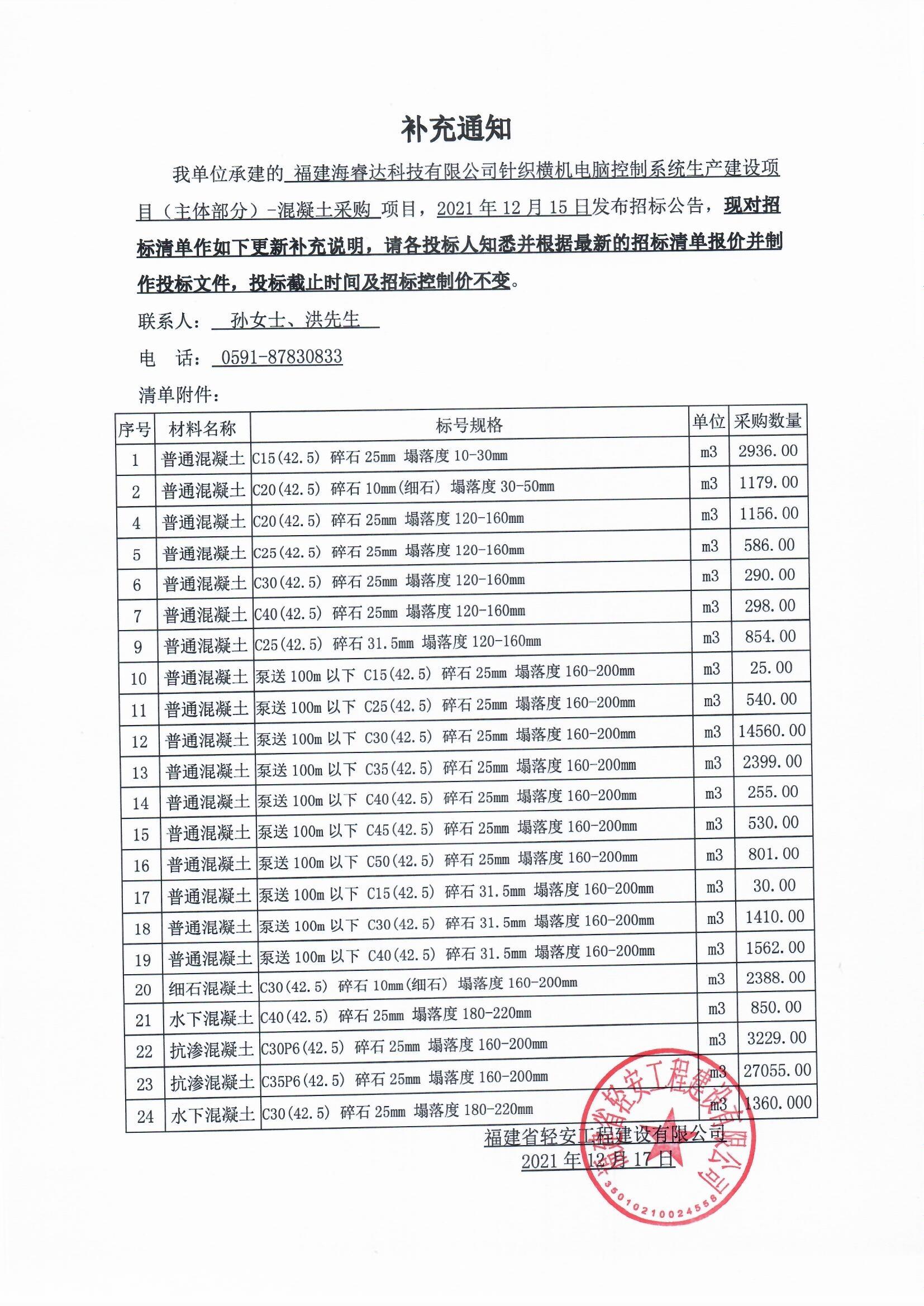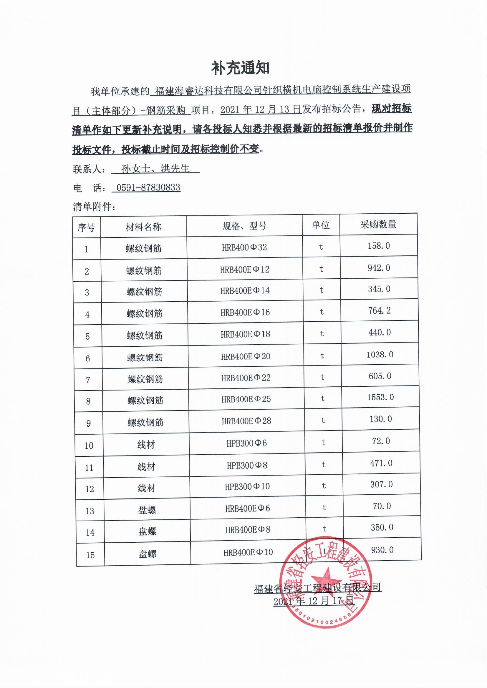 福建海睿達科技有限公司針織橫機電腦控製係統生產建設項目(主體部分)-鋼筋及混凝土采購補充說明
