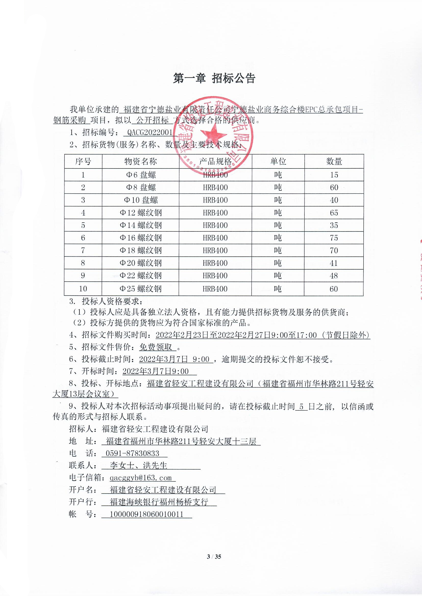 福建省寧德鹽業有限責任公司寧德鹽業商務綜合樓EPC總承包項目-鋼筋采購招標公告
