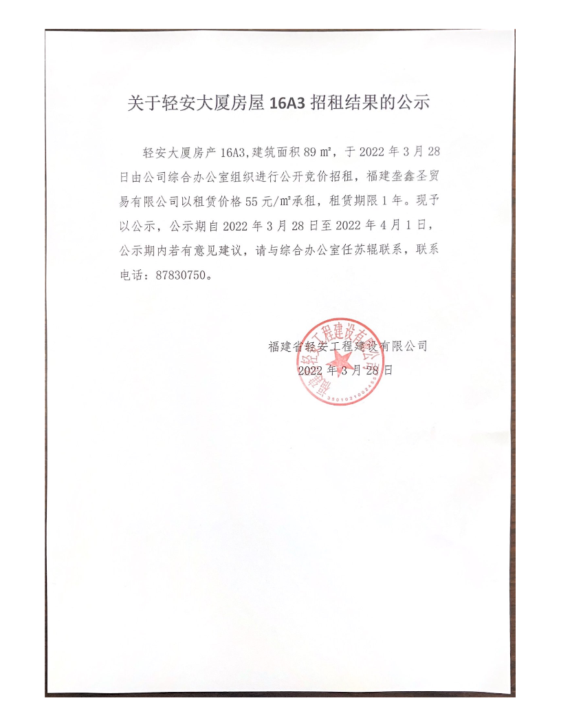 福建省輕安工程建設有限公司關於輕安大廈房屋16A3招租結果的公示