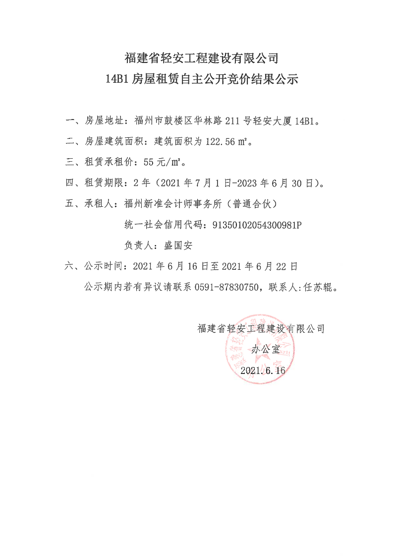 福建省輕安工程建設有限公司14B1房屋租賃自主公開競價結果公示