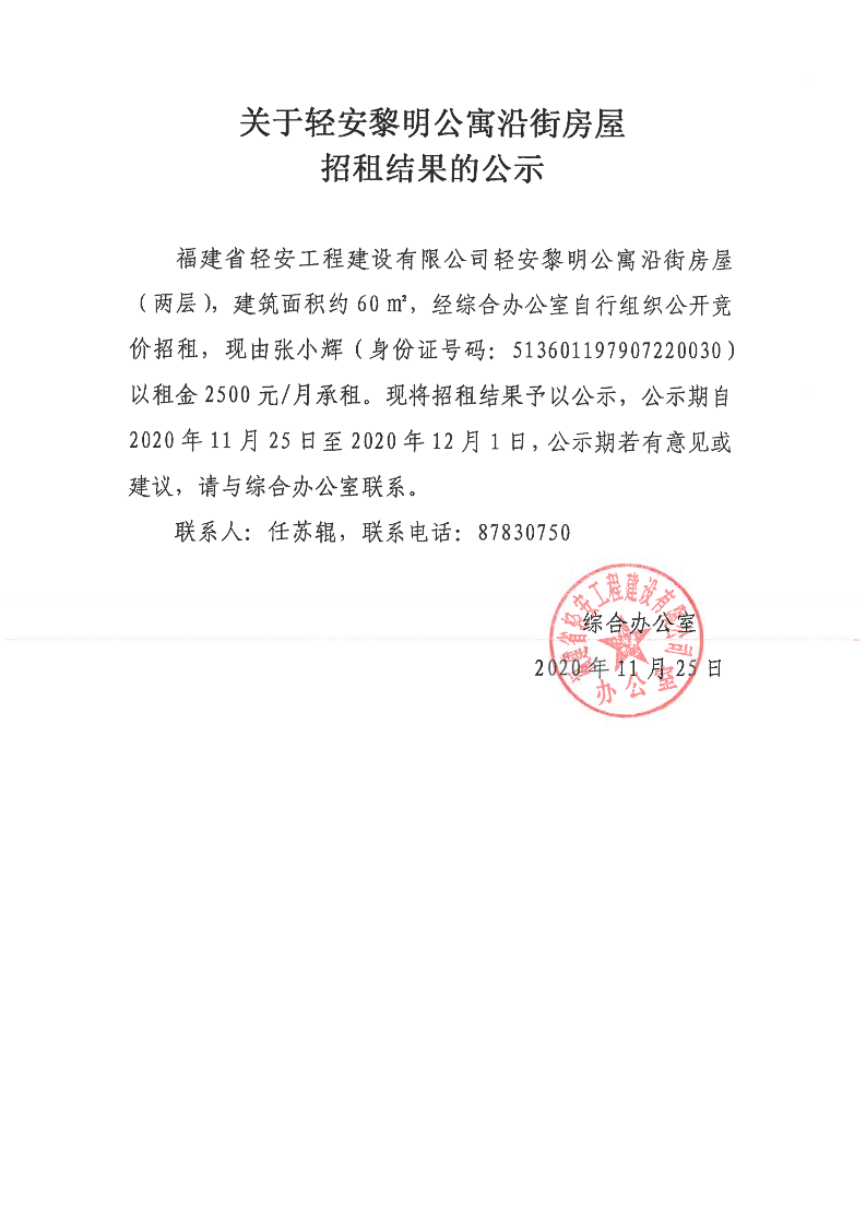 福建省輕安工程建設有限公司關於黎明公寓沿街房屋招租結果的公示
