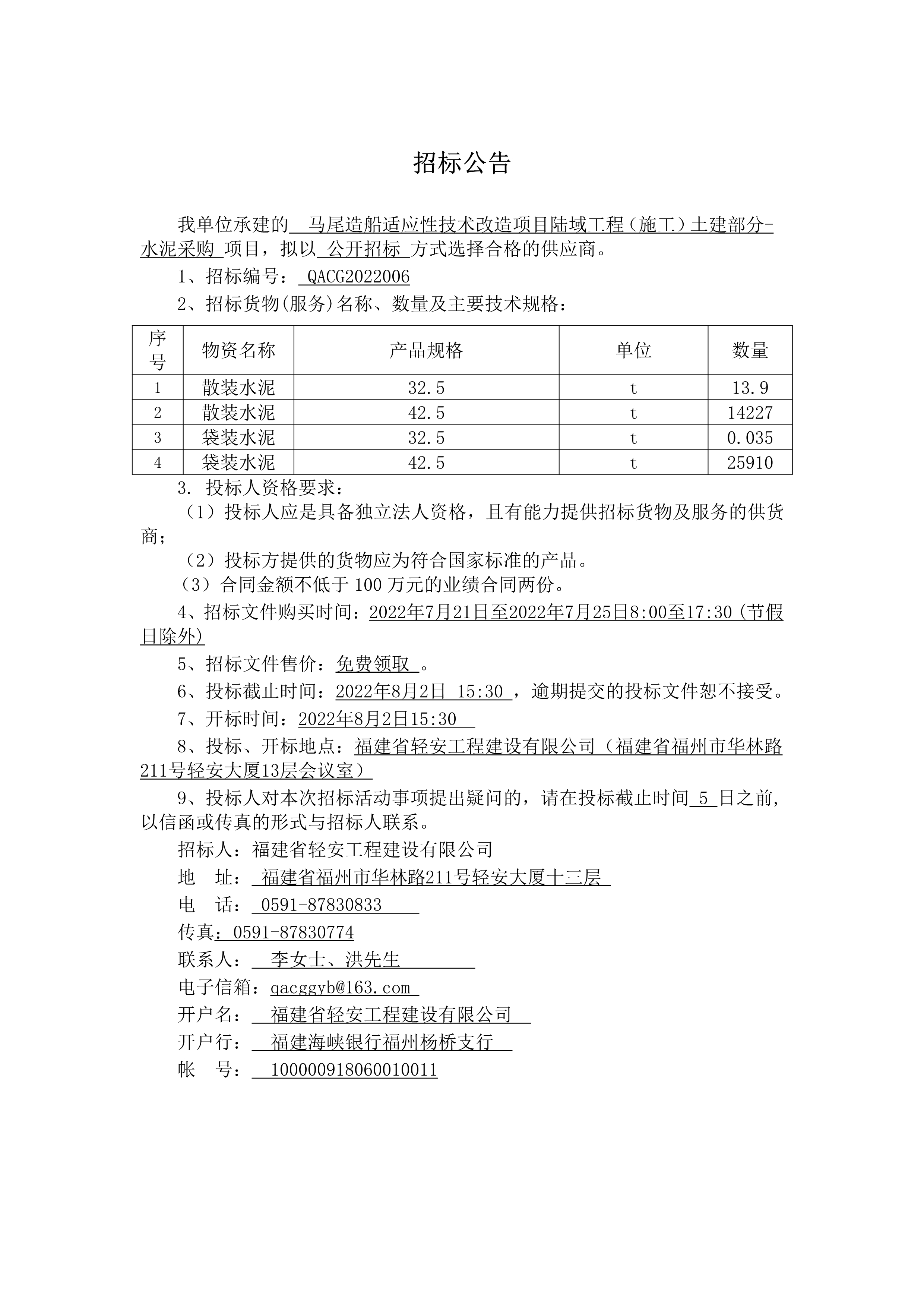 馬尾造船適應性技術改造項目陸域工程(施工)土建部分-水泥采購(QACG2022006)招標公告