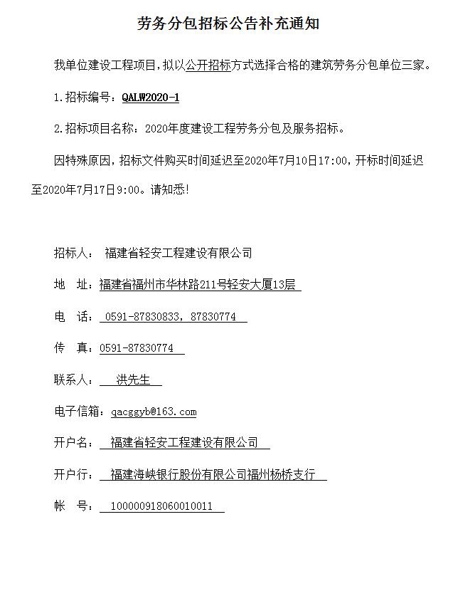 2020年福建省輕安工程建設有限公司-勞務分包招標公告補充通知