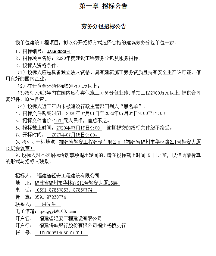 福建省輕安工程建設有限公司建設工程勞務分包及服務招標公告(招標編號:QALW2020-1)