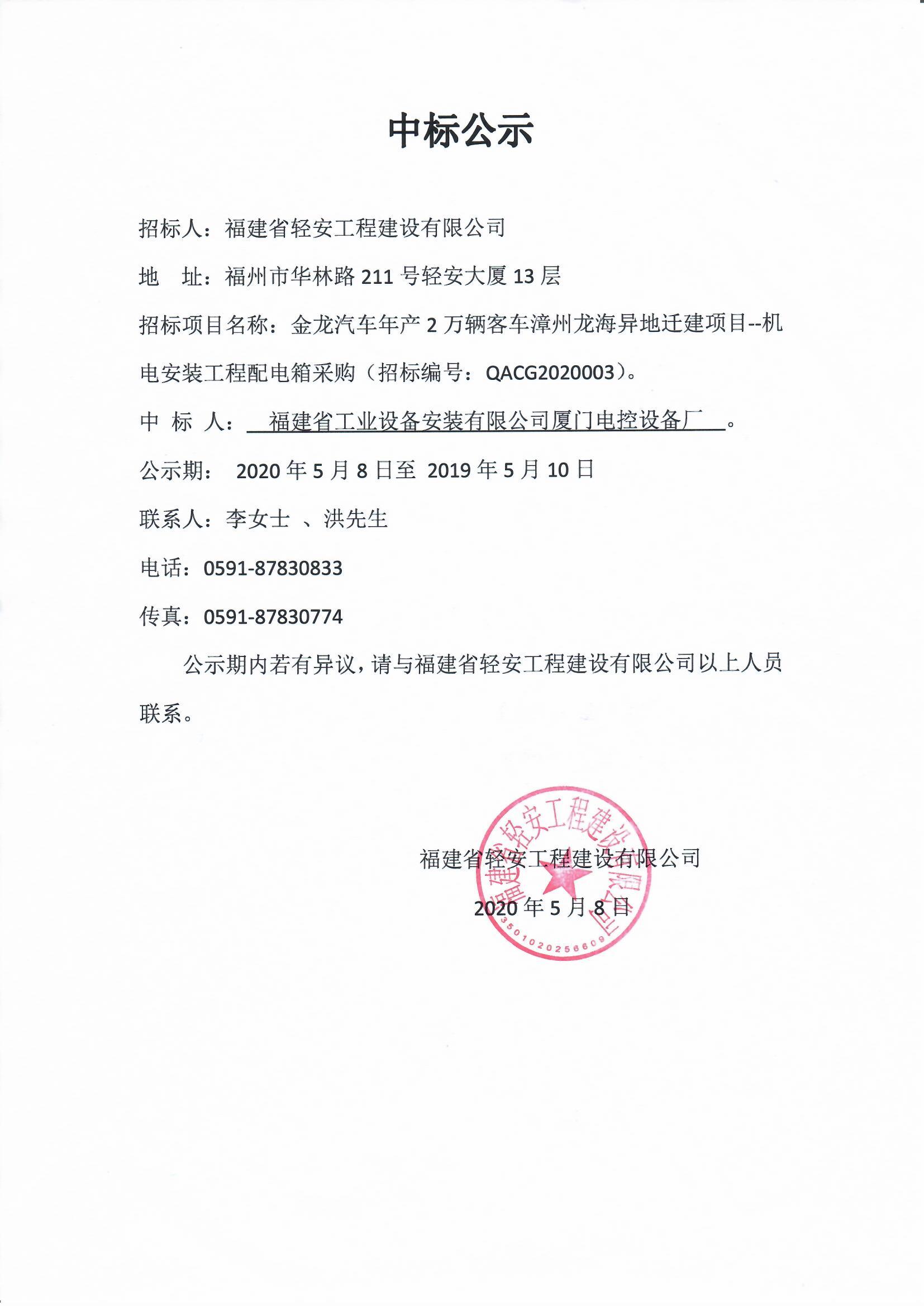 金龍汽車年產2萬輛客車漳州龍海異地遷建項目機電安裝工程配電箱采購-中標公示